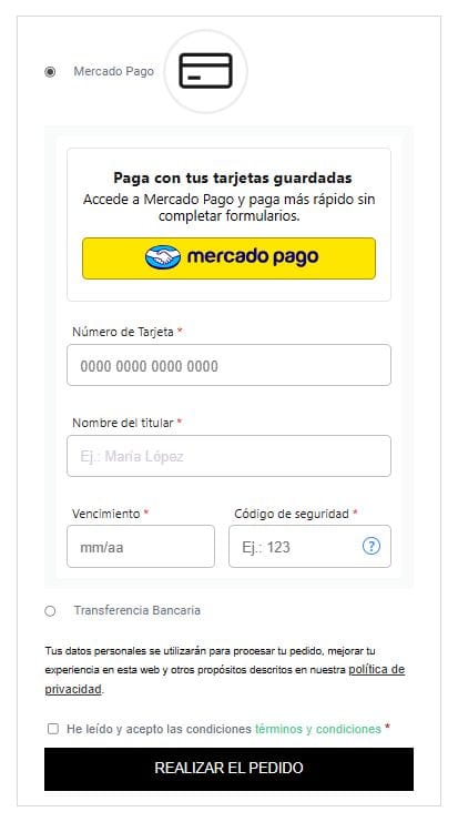 Para las compras online, contamos con todas las opciones de Mercado Pago y transferencia bancaria.Podrás visualizarlas de esta manera al momento de cerrar tu compra: