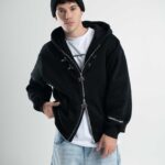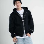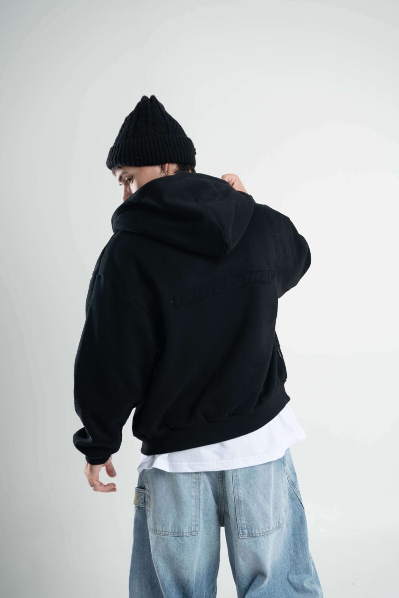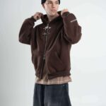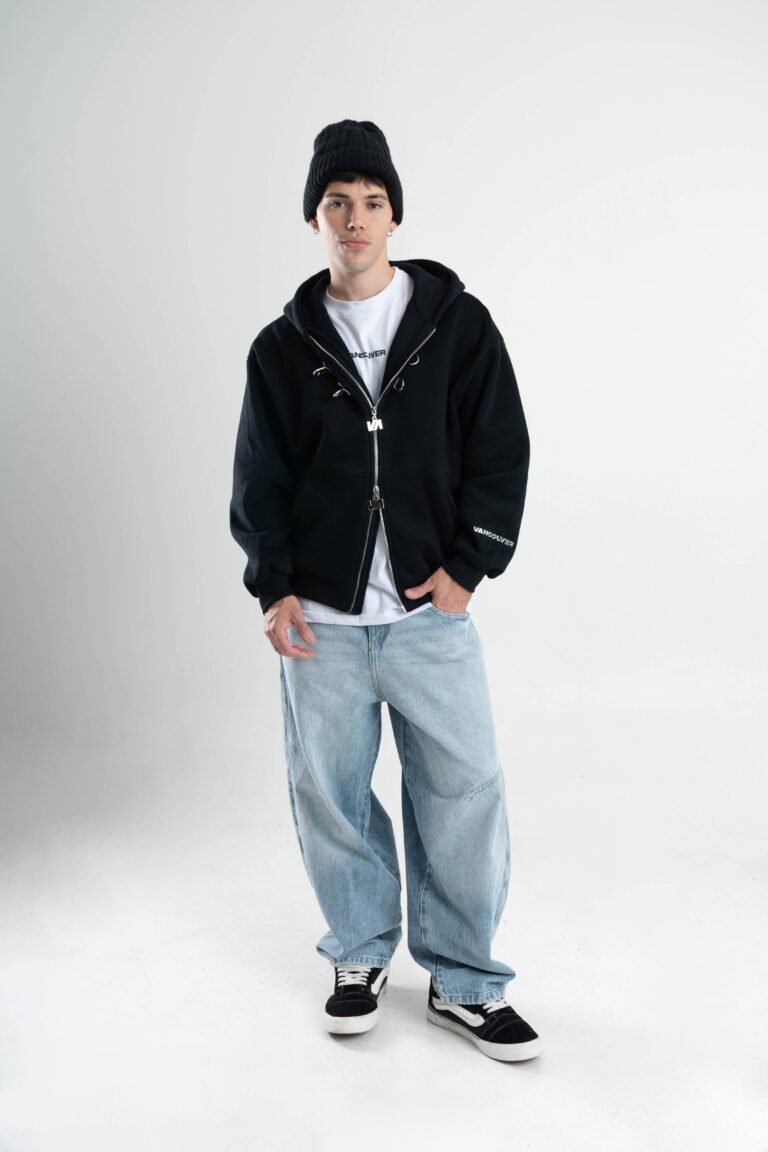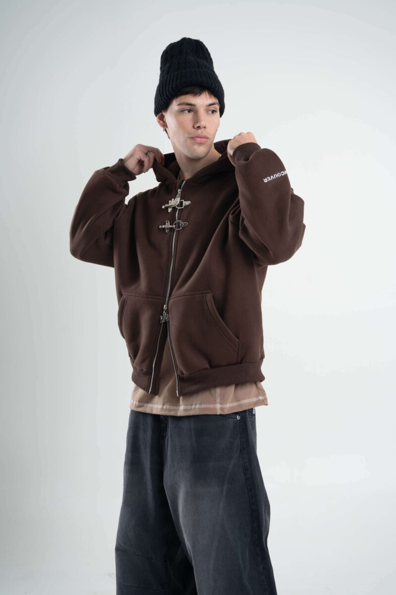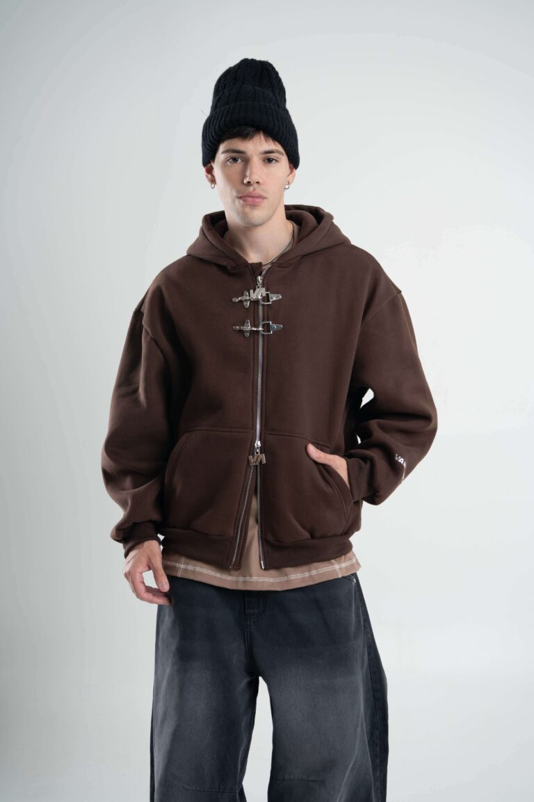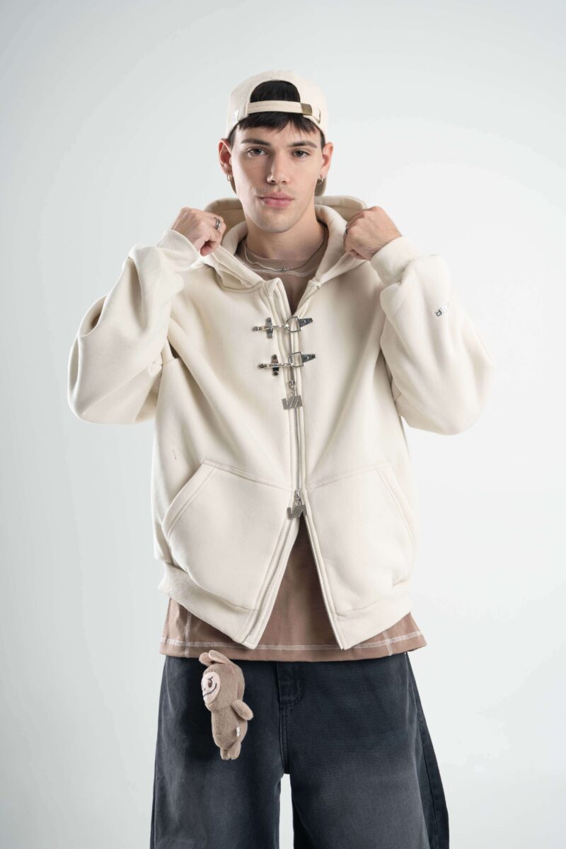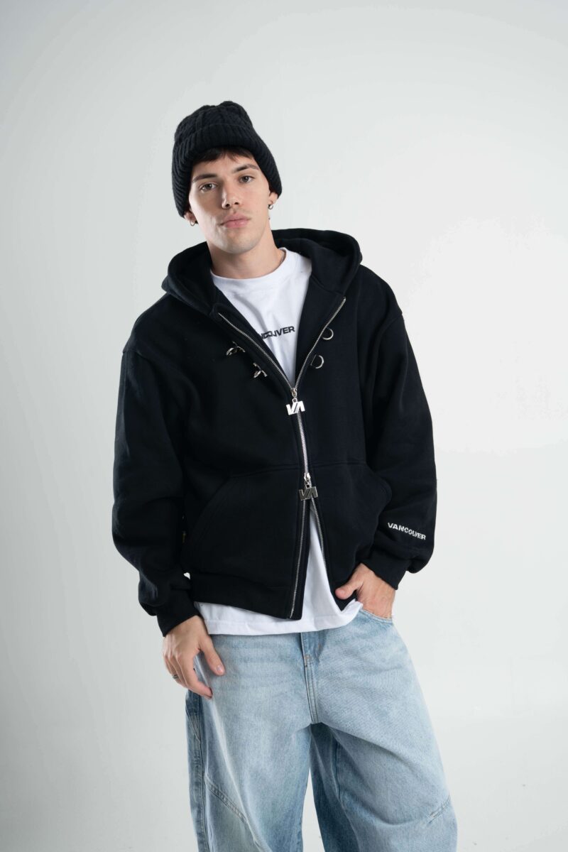 Friza importada en calce boxy con cierre doble camino y alamares metálicos que le meten carácter desde el primer vistazo. Capucha, bolsillo canguro y detalles de marca entre efecto metálico y aplique en espalda que levantan todo el look.