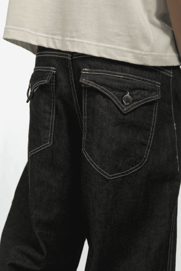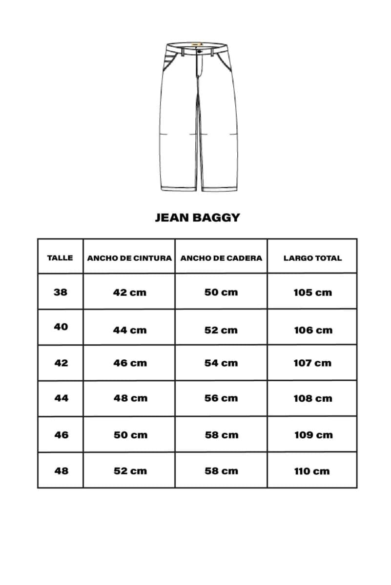 Jean de corte baggy. Construcción de cinco bolsillos y recortes en delantero. Bolsillos traseros con tapa, ojal y botón. Con lavado raw, que mantiene el color del denim original. Cartera con cierre metálico, hilos en color blanco y avíos personalizados en color níquel. Está confeccionado en denim rígido 100% algodón.