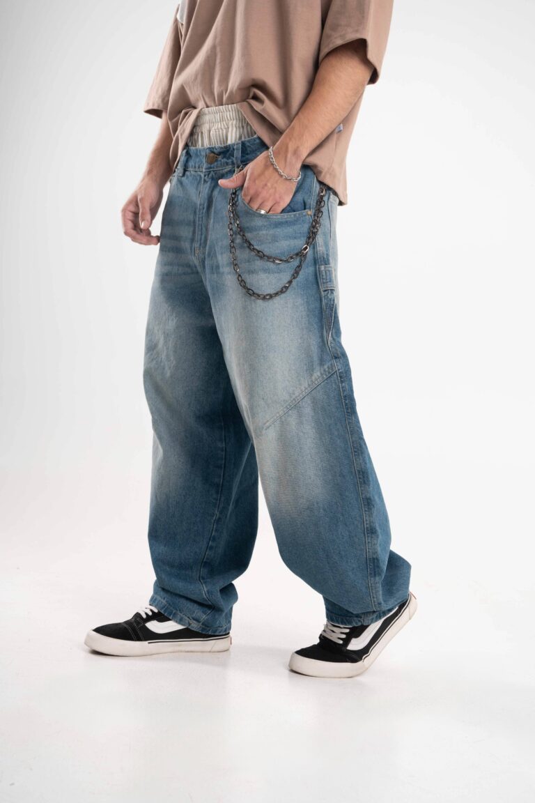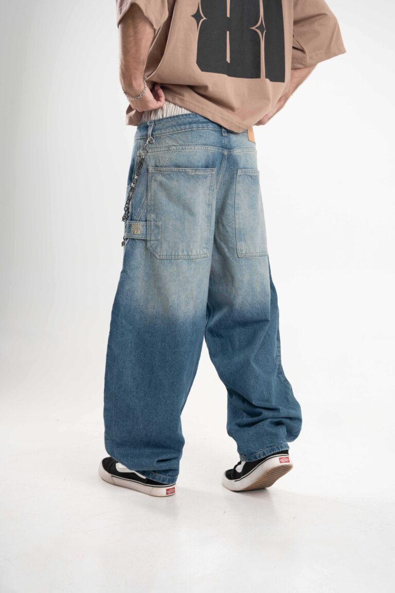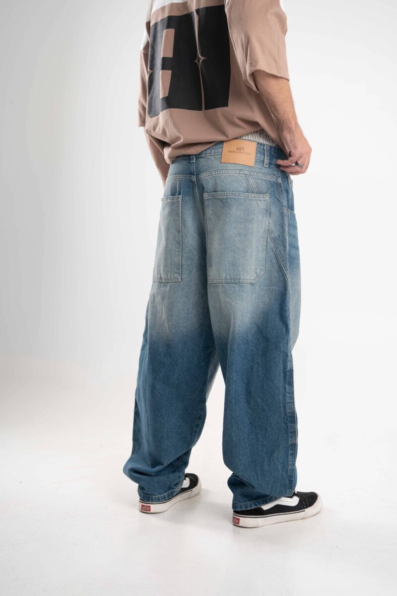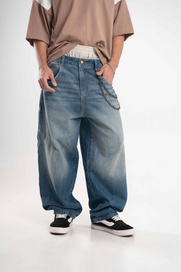 Jean de calce balloon confeccionado en denim rígido premium, con lavado azul medio acid wash que aporta profundidad y carácter.