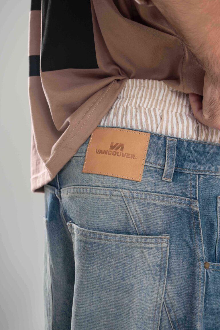 Presenta tres bolsillos delanteros, recortes en delantero y espalda, costuras en hilo camel, botón y remaches en tono bronce y badana de cuero camel. Incorpora tira carpintera bordada, con efecto localizado, tags, matizado y bigotes láser que refuerzan su estética urbana.