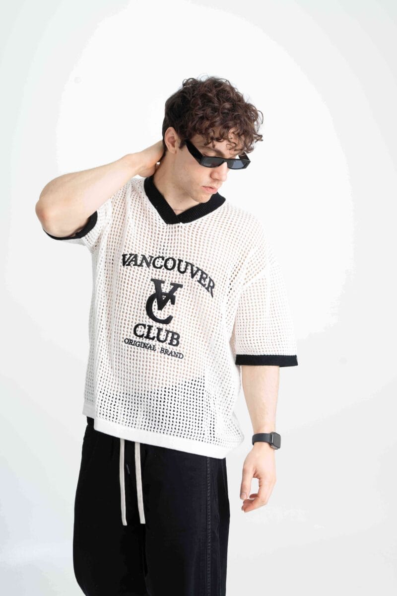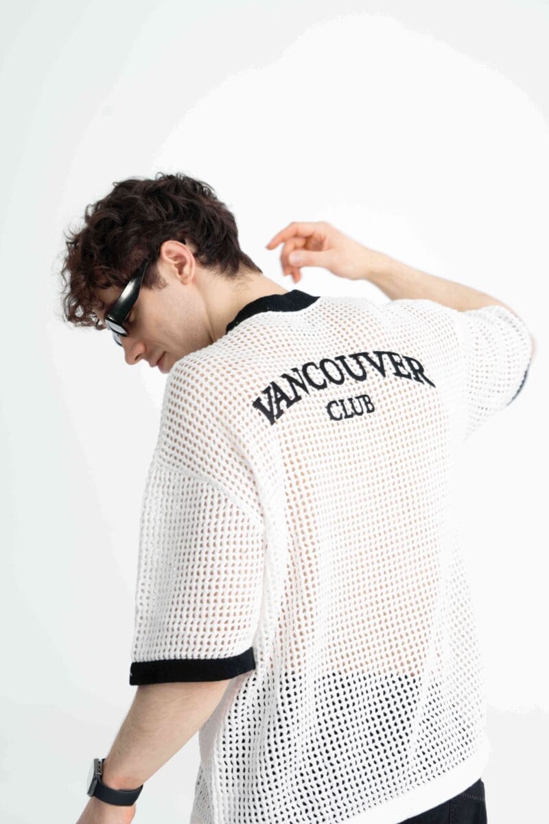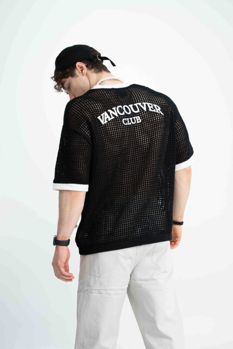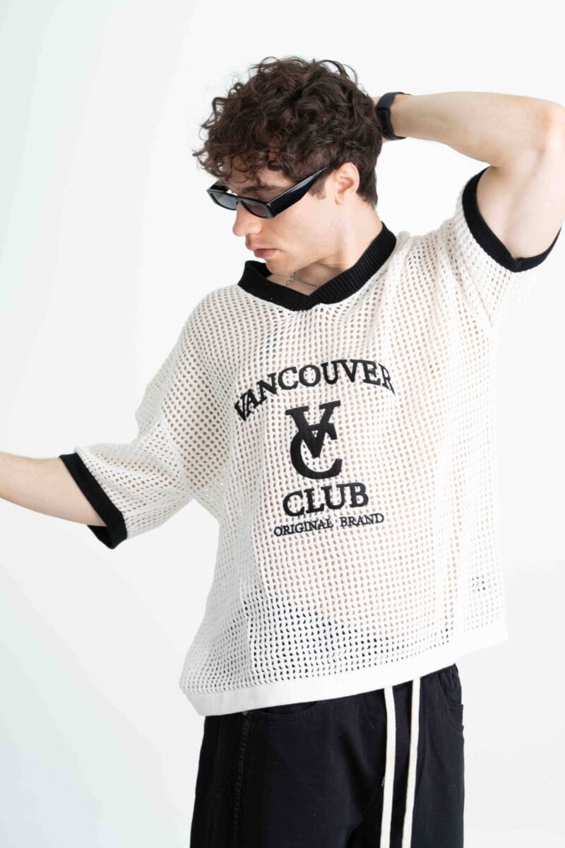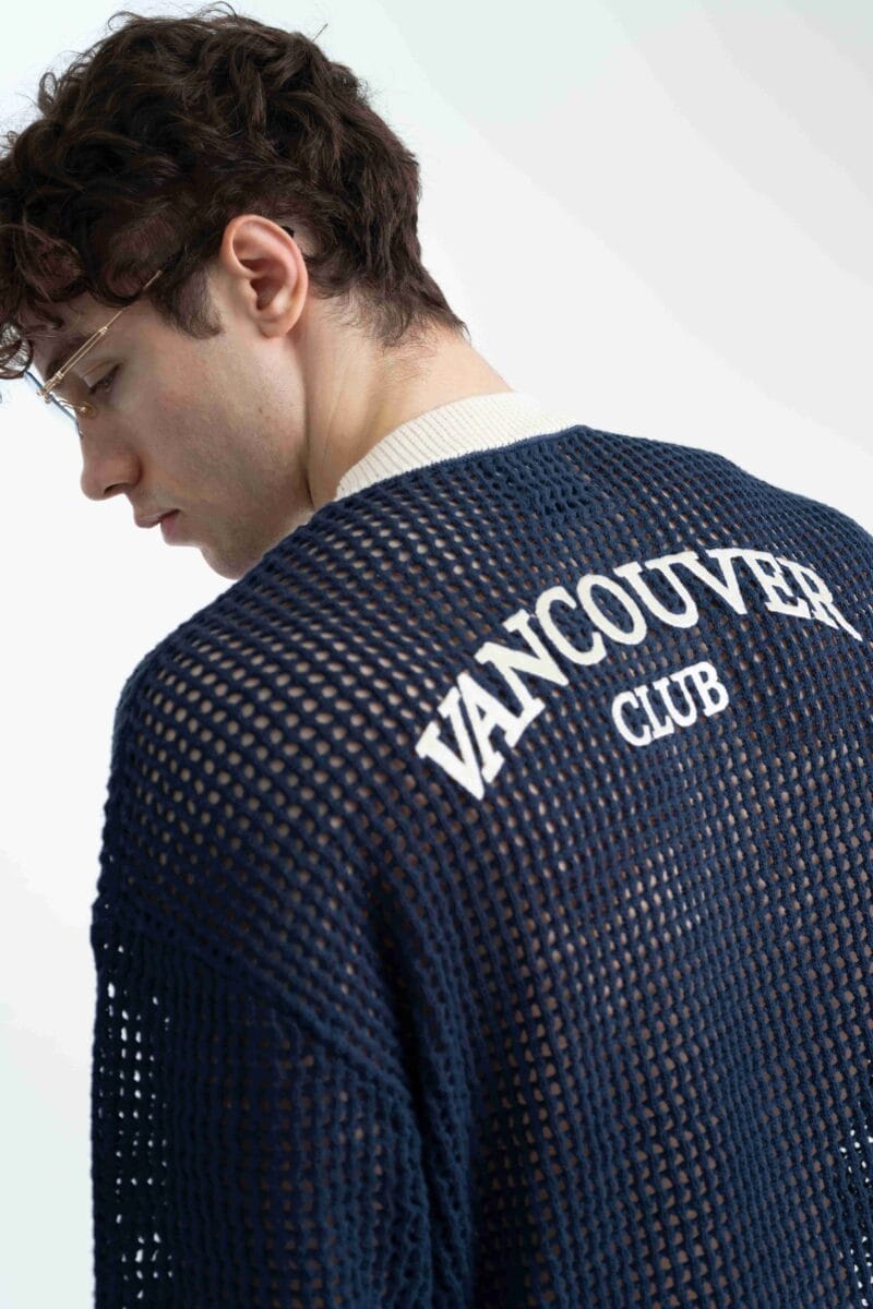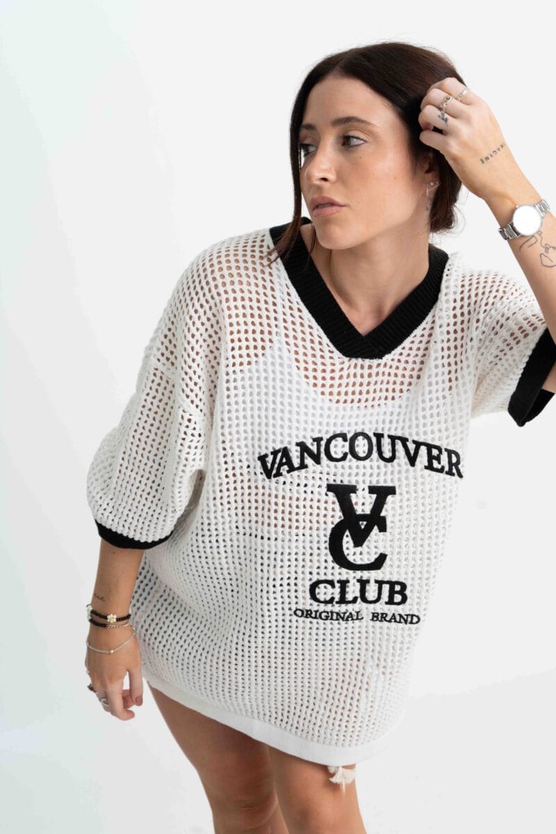 Oversize y fresca, tejida con punto abierto que marca un aire deportivo y urbano. El contraste entre cuello y puños a tono con el bordado frontal le da identidad y fuerza visual. Ideal para destacar sin perder comodidad.