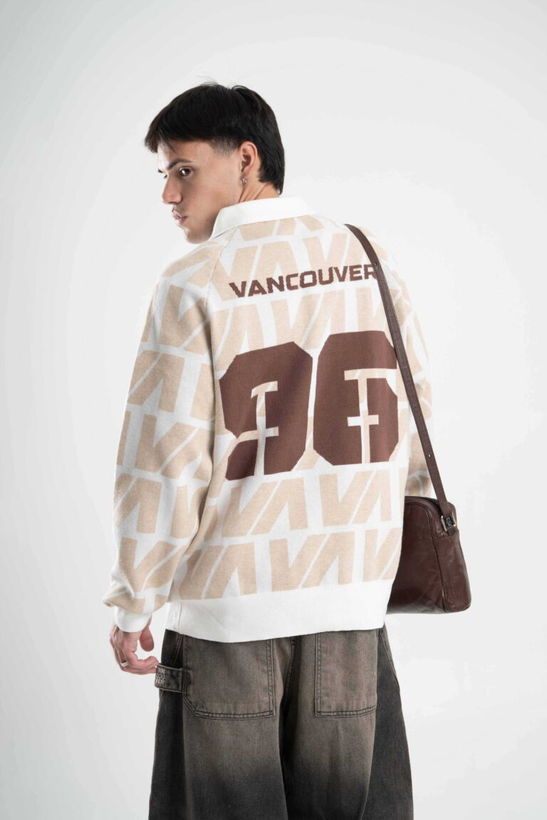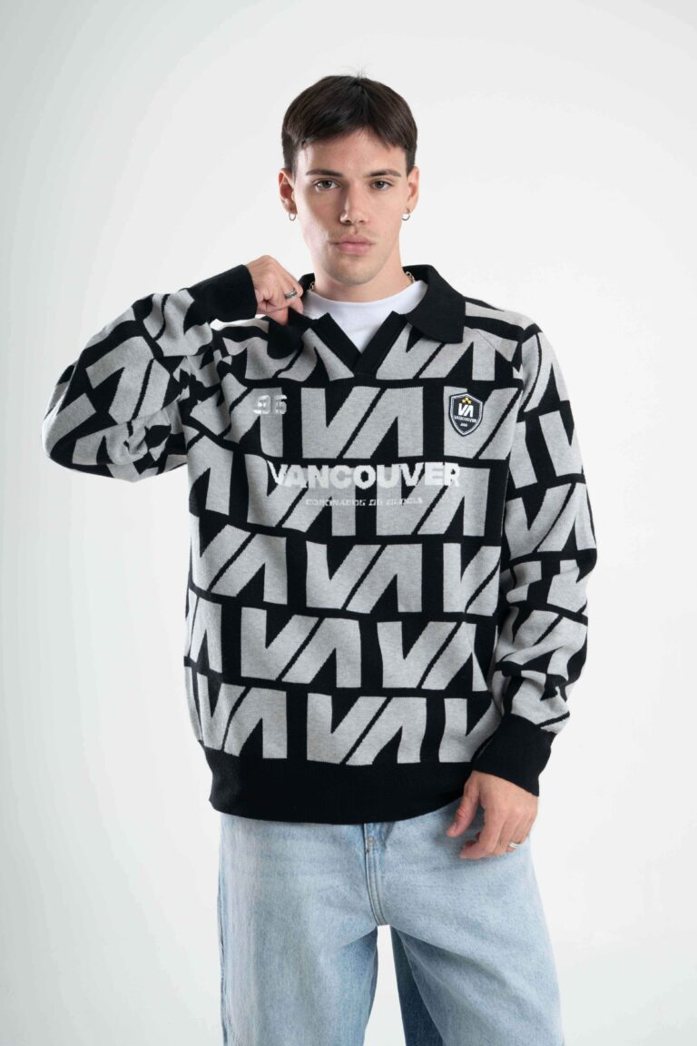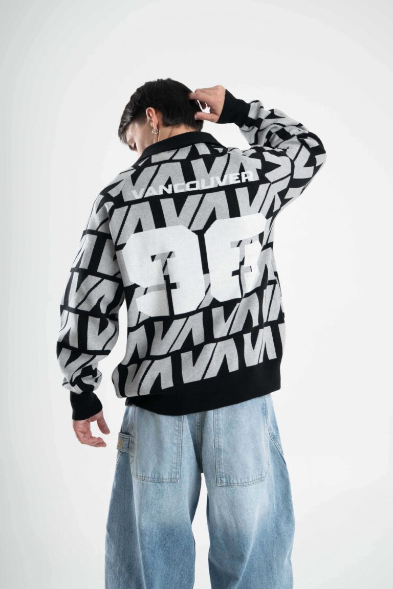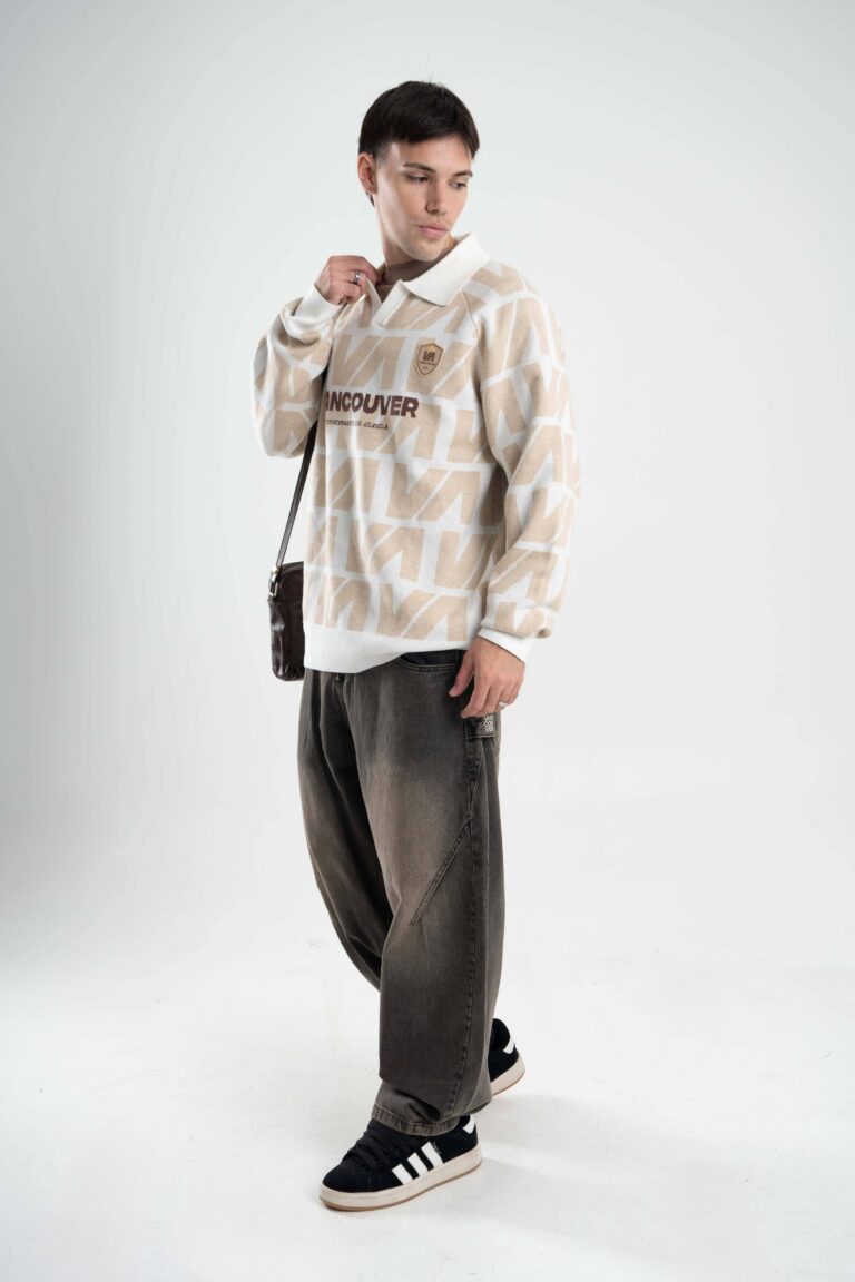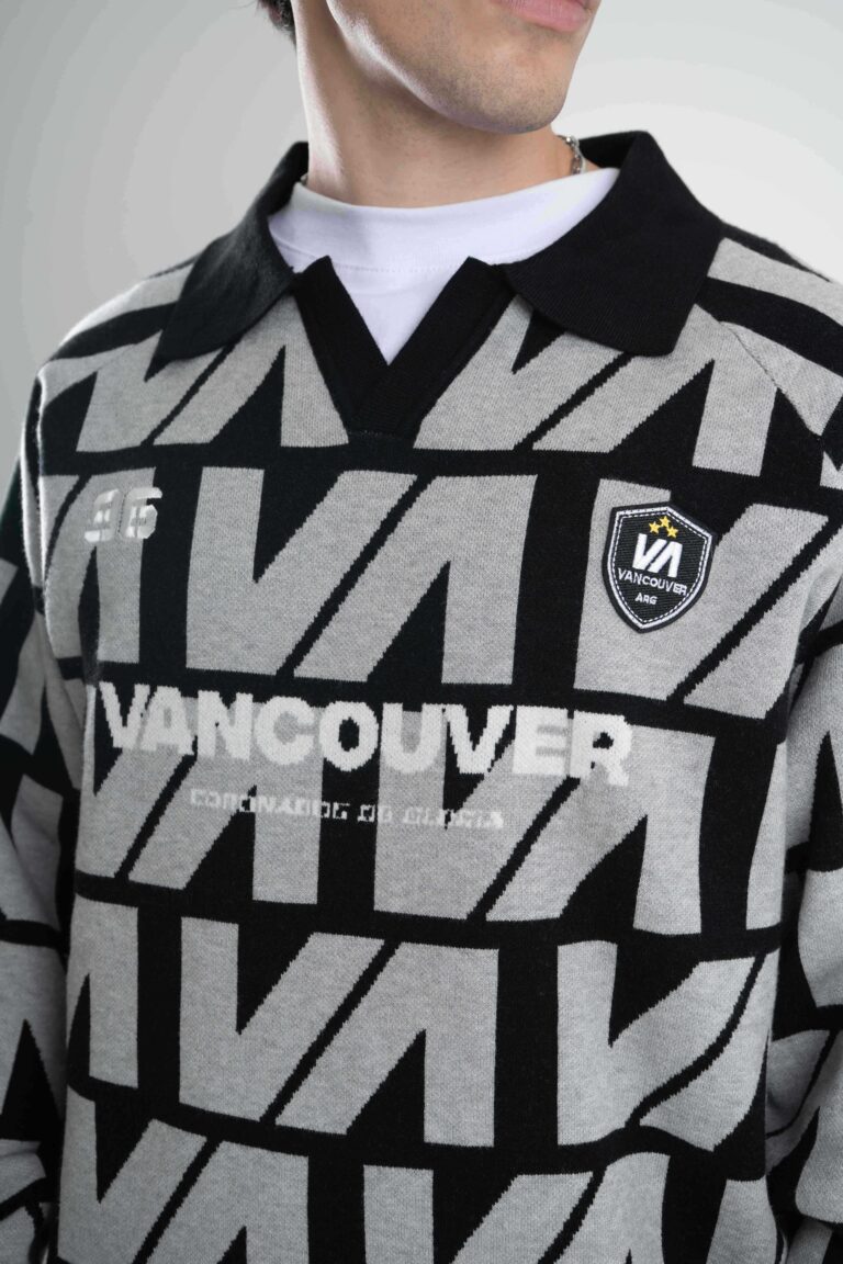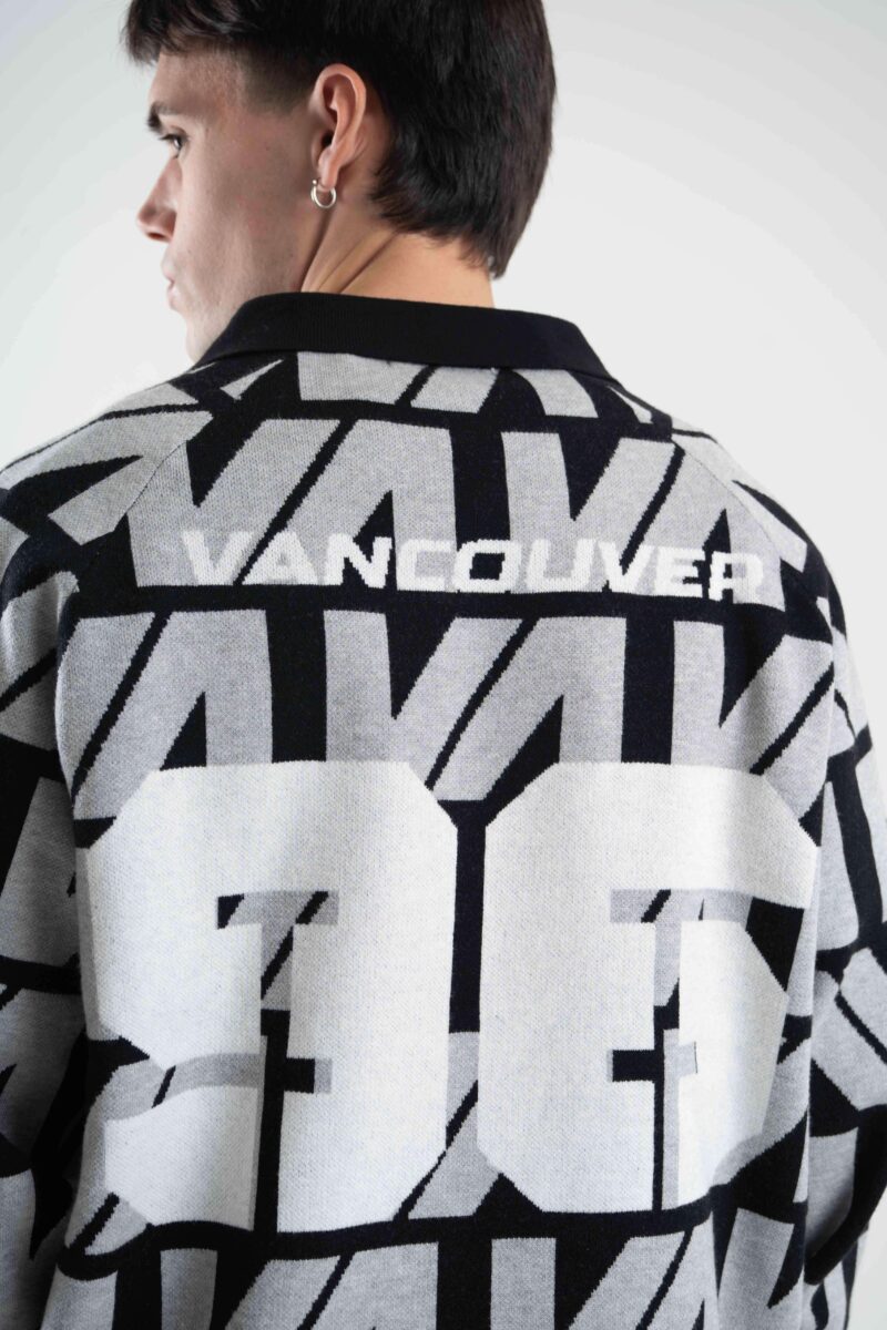 Tejido oversize con cuello polo y rapport de marca que recorre toda la prenda, marcando un look protagonista. Bordados y parches suman carácter para elevar cualquier outfit.