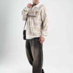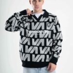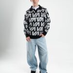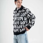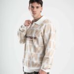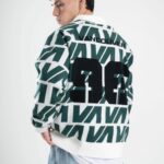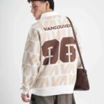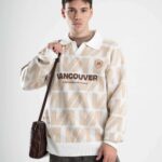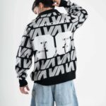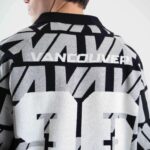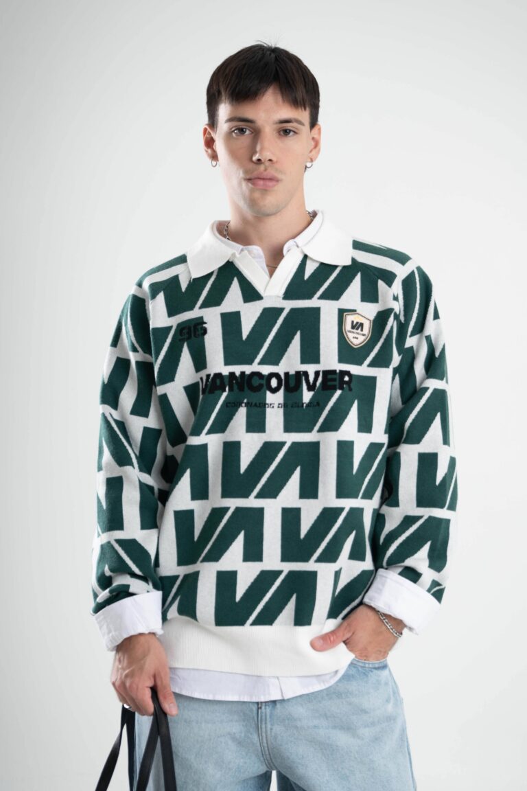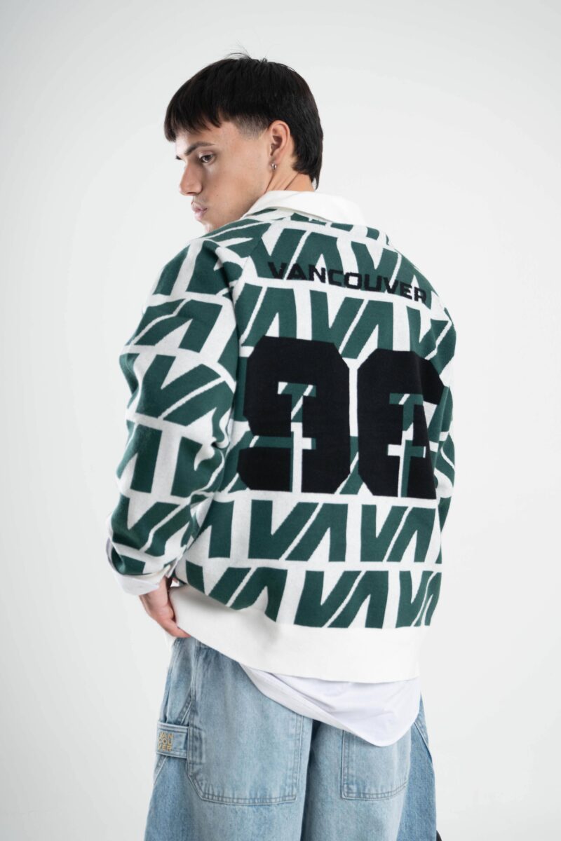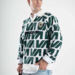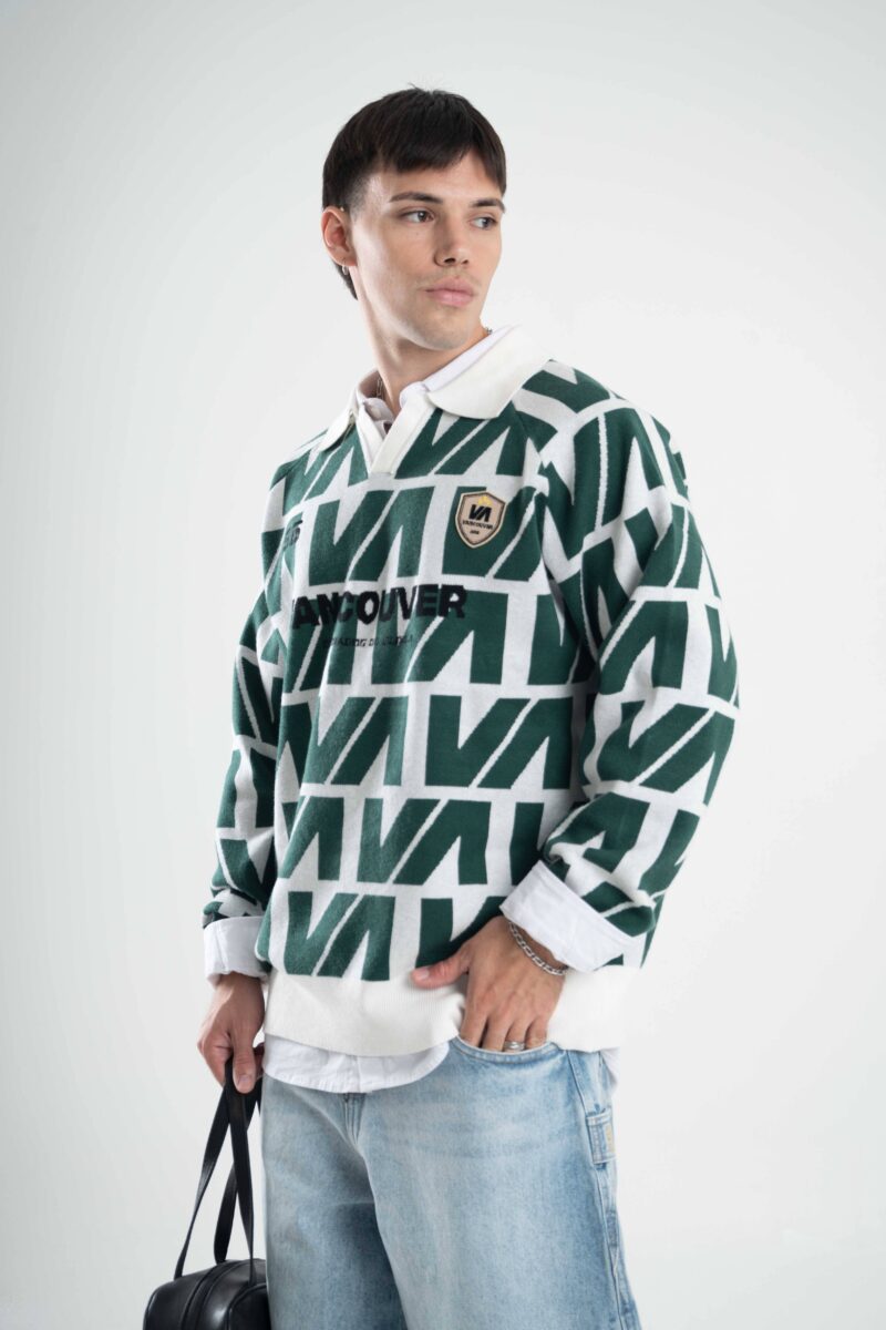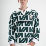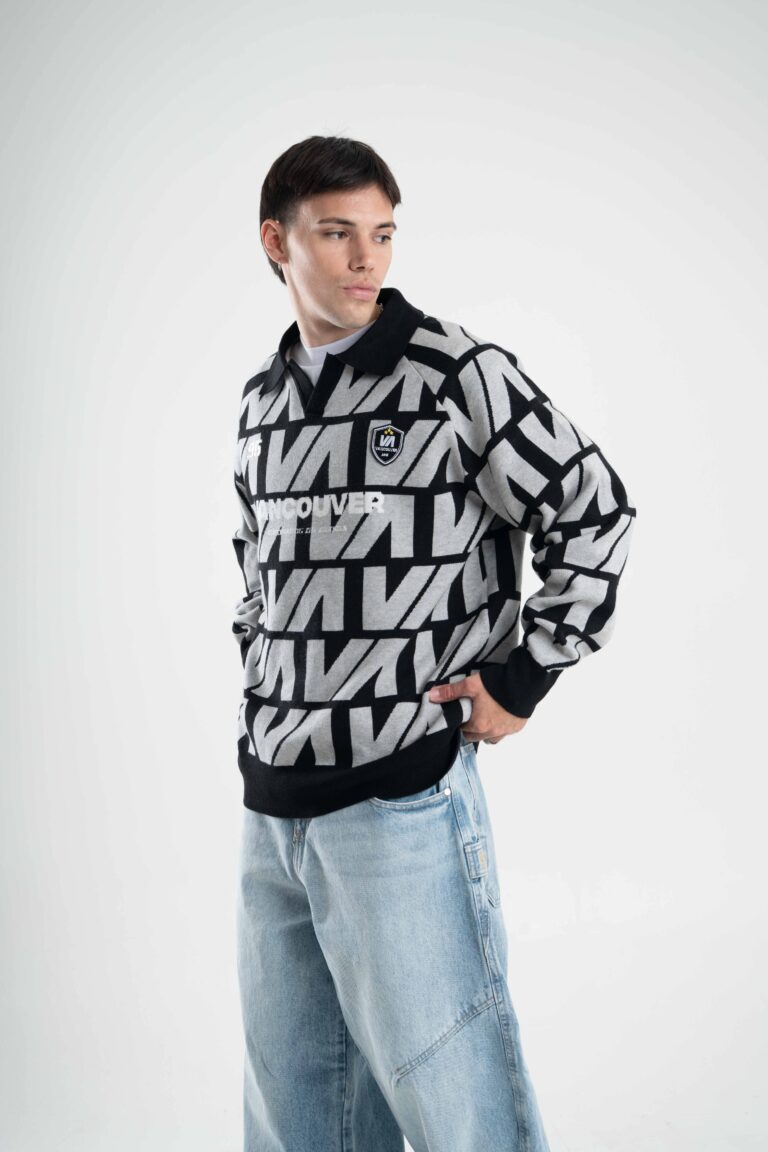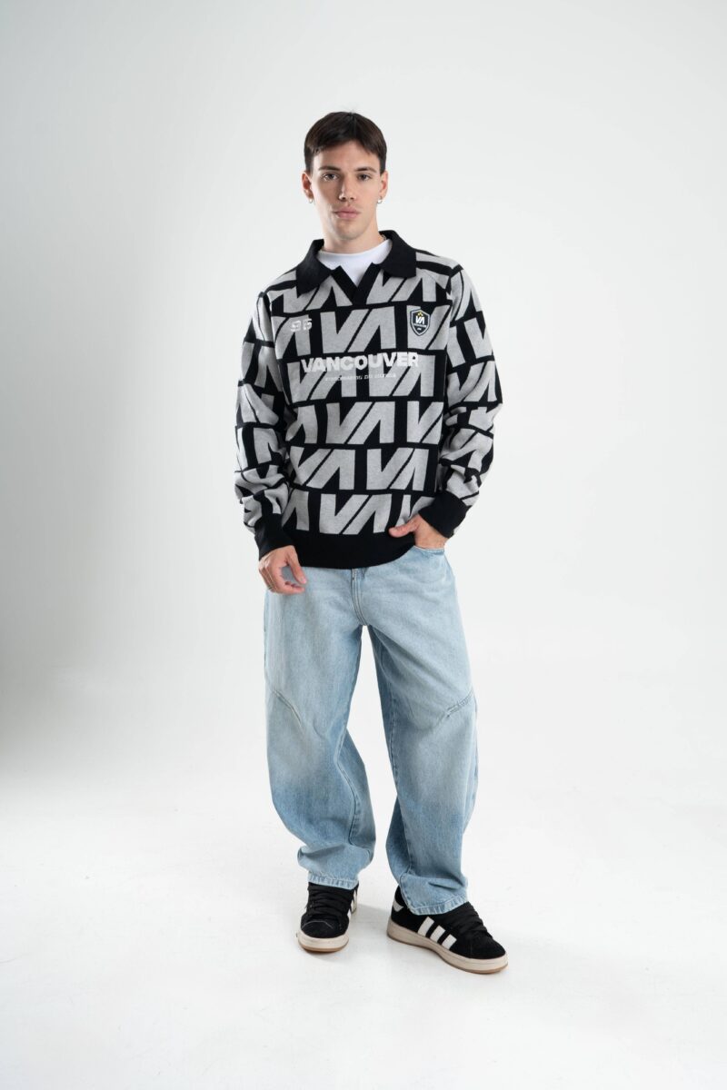 Tejido oversize con cuello polo y rapport de marca que recorre toda la prenda, marcando un look protagonista. Bordados y parches suman carácter para elevar cualquier outfit.